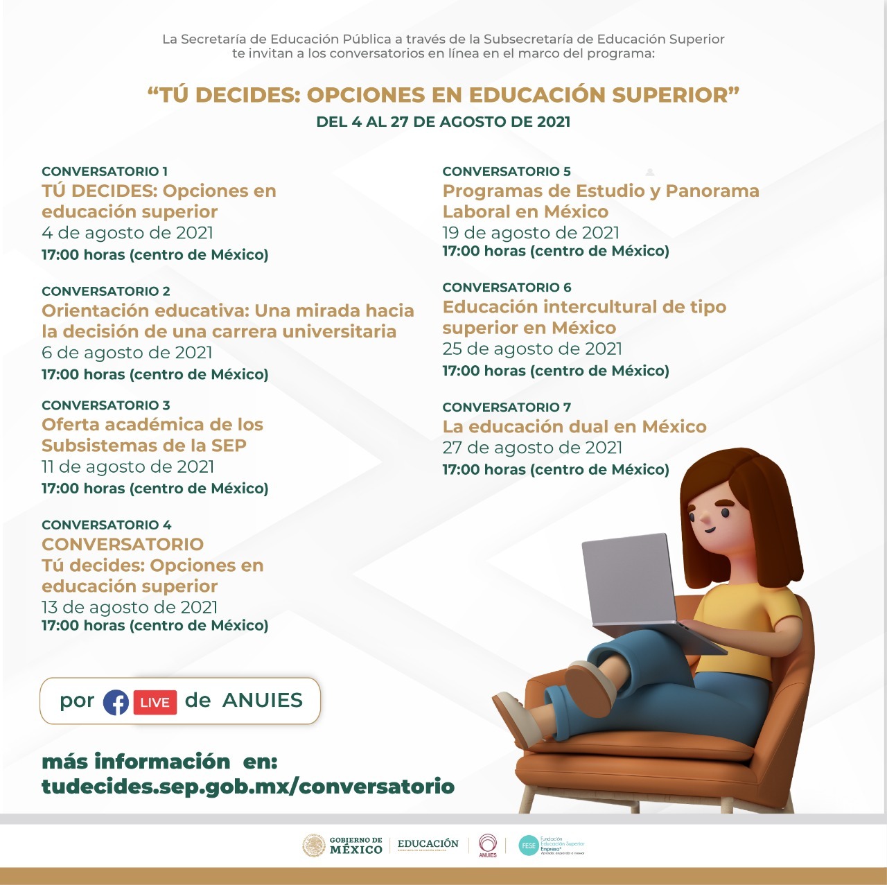 La Secretaría de Educación Pública a través de la Subsecretaría de Educación Media Superior invitan a los conversatorios en línea ”TÚ DECIDES: OPCIONES EN EDUCACIÓN SUPERIOR” del 4 al 27 de agosto de 2021, a través de Facebook Live de ANUIES.